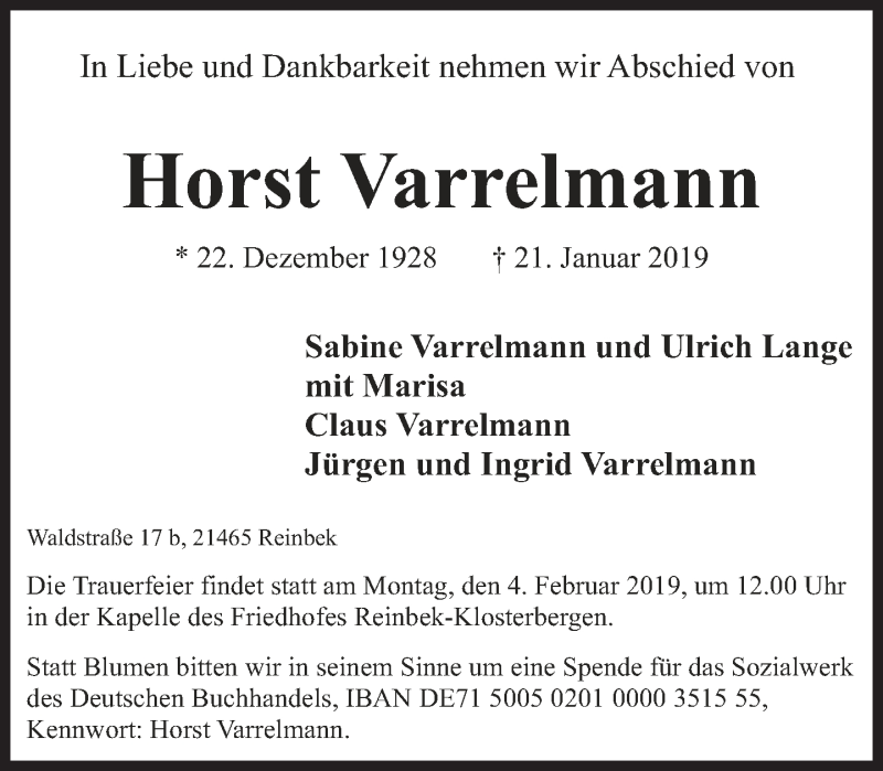 Hier finden Sie alle Traueranzeigen aus der Zeitung, die bisher für Horst Varrelmann erschienen sind. Weitere Traueranzeigen, die in der Zeitung erscheinen, werden hier ebenfalls aufgelistet