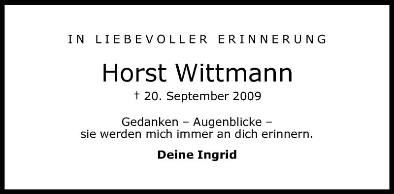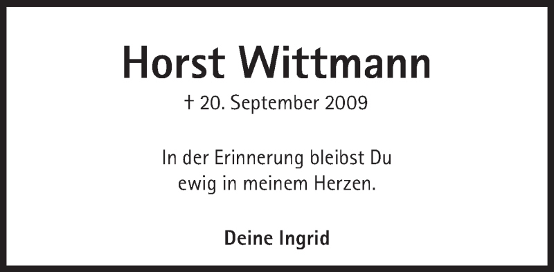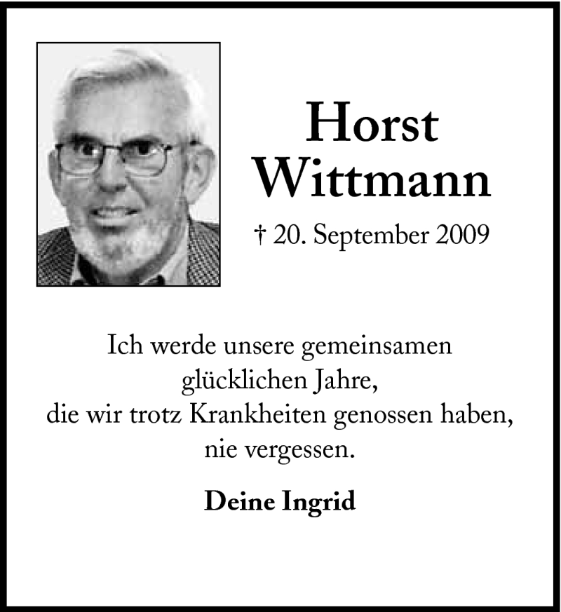 Hier finden Sie alle Traueranzeigen aus der Zeitung, die bisher für Horst Wittmann erschienen sind. Weitere Traueranzeigen, die in der Zeitung erscheinen, werden hier ebenfalls aufgelistet