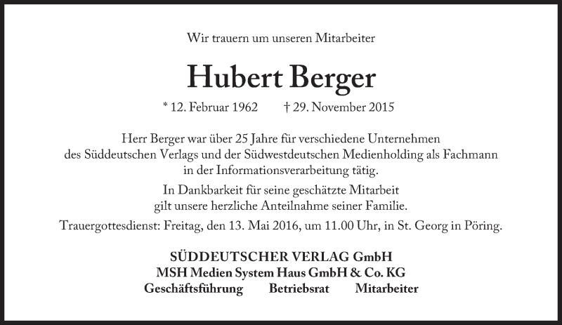 Hier finden Sie alle Traueranzeigen aus der Zeitung, die bisher für Hubert Berger erschienen sind. Weitere Traueranzeigen, die in der Zeitung erscheinen, werden hier ebenfalls aufgelistet