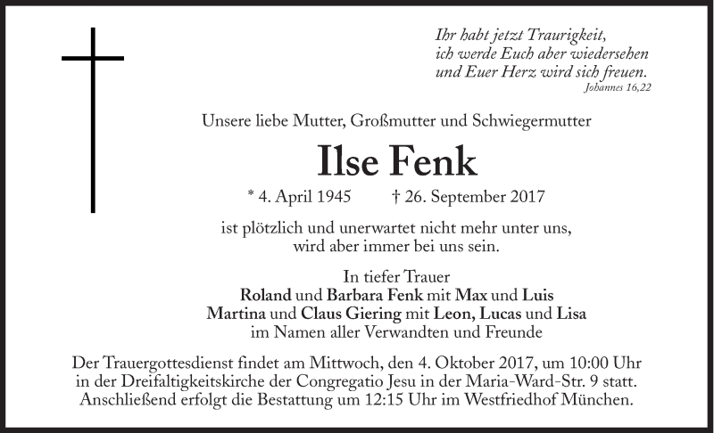 Hier finden Sie alle Traueranzeigen aus der Zeitung, die bisher für Ilse Fenk erschienen sind. Weitere Traueranzeigen, die in der Zeitung erscheinen, werden hier ebenfalls aufgelistet