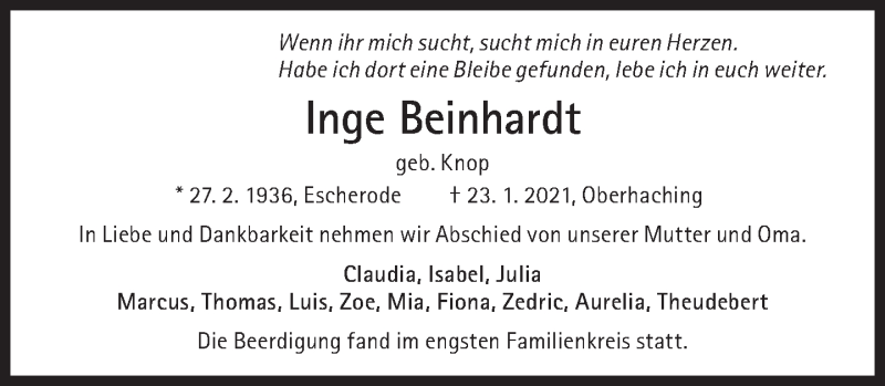 Hier finden Sie alle Traueranzeigen aus der Zeitung, die bisher für Inge Beinhardt erschienen sind. Weitere Traueranzeigen, die in der Zeitung erscheinen, werden hier ebenfalls aufgelistet