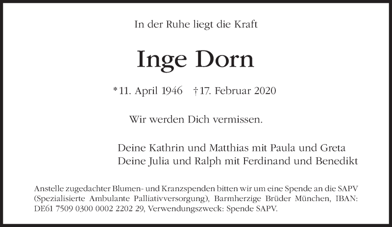 Hier finden Sie alle Traueranzeigen aus der Zeitung, die bisher für Inge Dorn erschienen sind. Weitere Traueranzeigen, die in der Zeitung erscheinen, werden hier ebenfalls aufgelistet