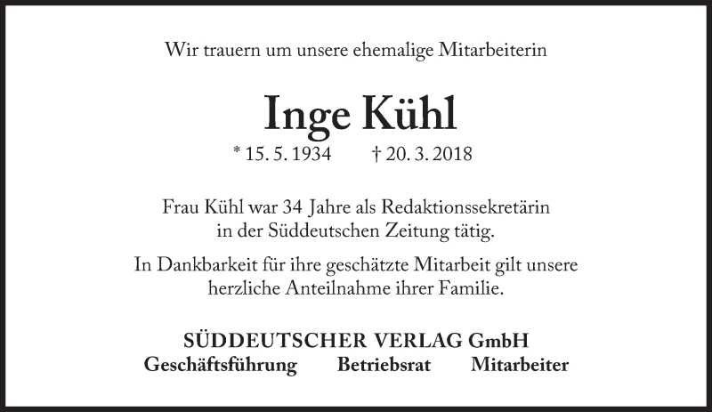 Hier finden Sie alle Traueranzeigen aus der Zeitung, die bisher für Inge Kühl erschienen sind. Weitere Traueranzeigen, die in der Zeitung erscheinen, werden hier ebenfalls aufgelistet
