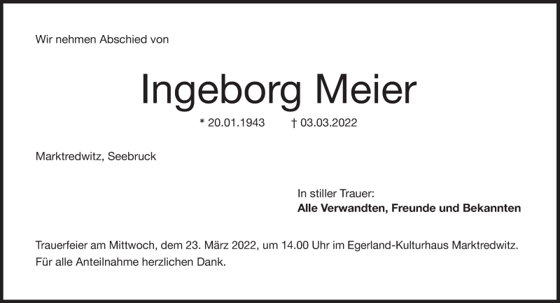 Hier finden Sie alle Traueranzeigen aus der Zeitung, die bisher für Ingeborg Meier erschienen sind. Weitere Traueranzeigen, die in der Zeitung erscheinen, werden hier ebenfalls aufgelistet