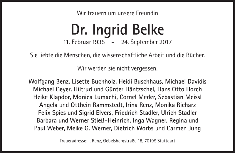 Hier finden Sie alle Traueranzeigen aus der Zeitung, die bisher für Ingrid Belke erschienen sind. Weitere Traueranzeigen, die in der Zeitung erscheinen, werden hier ebenfalls aufgelistet