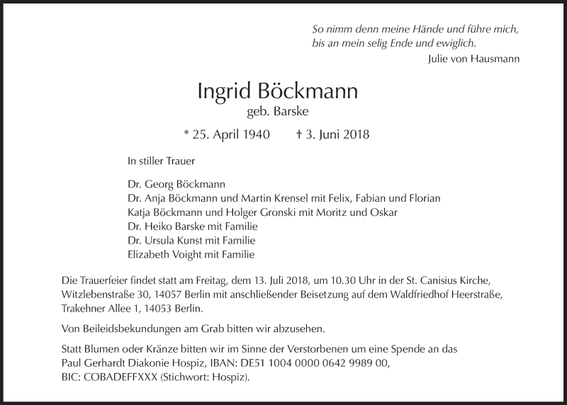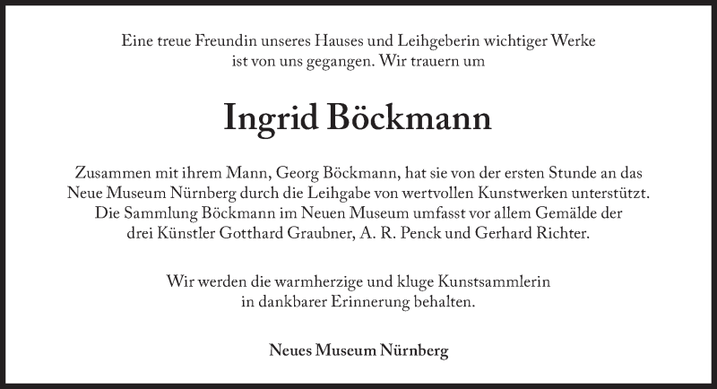 Hier finden Sie alle Traueranzeigen aus der Zeitung, die bisher für Ingrid Böckmann erschienen sind. Weitere Traueranzeigen, die in der Zeitung erscheinen, werden hier ebenfalls aufgelistet