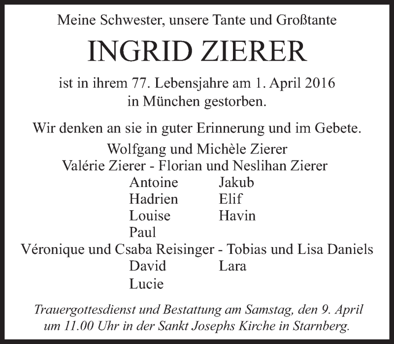 Hier finden Sie alle Traueranzeigen aus der Zeitung, die bisher für Ingrid Zierer erschienen sind. Weitere Traueranzeigen, die in der Zeitung erscheinen, werden hier ebenfalls aufgelistet