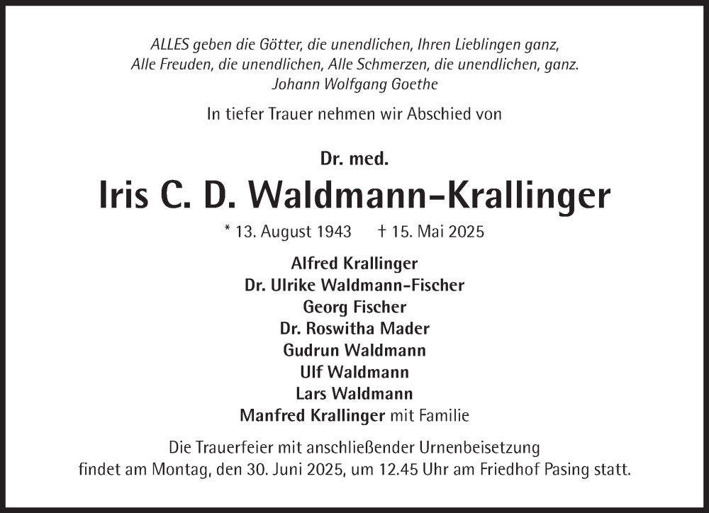 Hier finden Sie alle Traueranzeigen aus der Zeitung, die bisher für Iris C. D. Waldmann-Krallinger erschienen sind. Weitere Traueranzeigen, die in der Zeitung erscheinen, werden hier ebenfalls aufgelistet