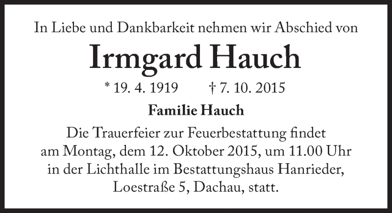 Hier finden Sie alle Traueranzeigen aus der Zeitung, die bisher für Irmgard Hauch erschienen sind. Weitere Traueranzeigen, die in der Zeitung erscheinen, werden hier ebenfalls aufgelistet