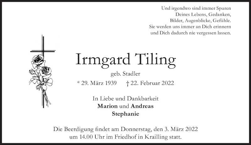 Hier finden Sie alle Traueranzeigen aus der Zeitung, die bisher für Irmgard Tiling erschienen sind. Weitere Traueranzeigen, die in der Zeitung erscheinen, werden hier ebenfalls aufgelistet