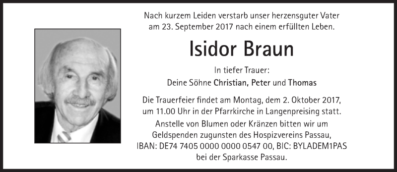 Hier finden Sie alle Traueranzeigen aus der Zeitung, die bisher für Isidor Braun erschienen sind. Weitere Traueranzeigen, die in der Zeitung erscheinen, werden hier ebenfalls aufgelistet