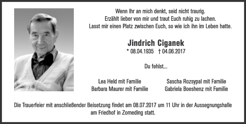 Hier finden Sie alle Traueranzeigen aus der Zeitung, die bisher für Jindrich Ciganek erschienen sind. Weitere Traueranzeigen, die in der Zeitung erscheinen, werden hier ebenfalls aufgelistet