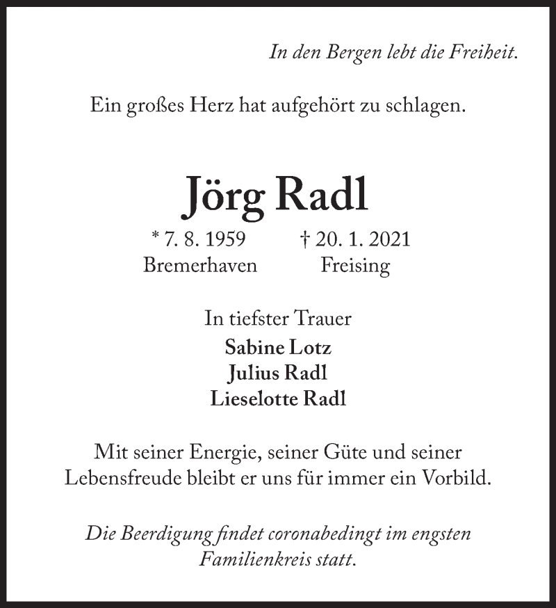 Hier finden Sie alle Traueranzeigen aus der Zeitung, die bisher für Jörg Radl erschienen sind. Weitere Traueranzeigen, die in der Zeitung erscheinen, werden hier ebenfalls aufgelistet