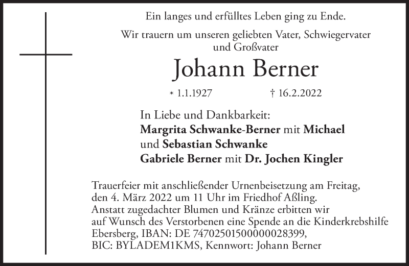 Hier finden Sie alle Traueranzeigen aus der Zeitung, die bisher für Johann Berner erschienen sind. Weitere Traueranzeigen, die in der Zeitung erscheinen, werden hier ebenfalls aufgelistet