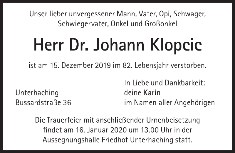 Hier finden Sie alle Traueranzeigen aus der Zeitung, die bisher für Johann Klopcic erschienen sind. Weitere Traueranzeigen, die in der Zeitung erscheinen, werden hier ebenfalls aufgelistet