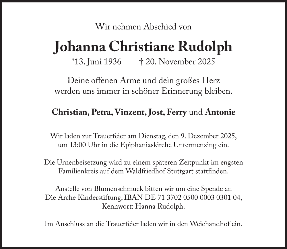 Hier finden Sie alle Traueranzeigen aus der Zeitung, die bisher für Johanna Christiane Rudolph erschienen sind. Weitere Traueranzeigen, die in der Zeitung erscheinen, werden hier ebenfalls aufgelistet