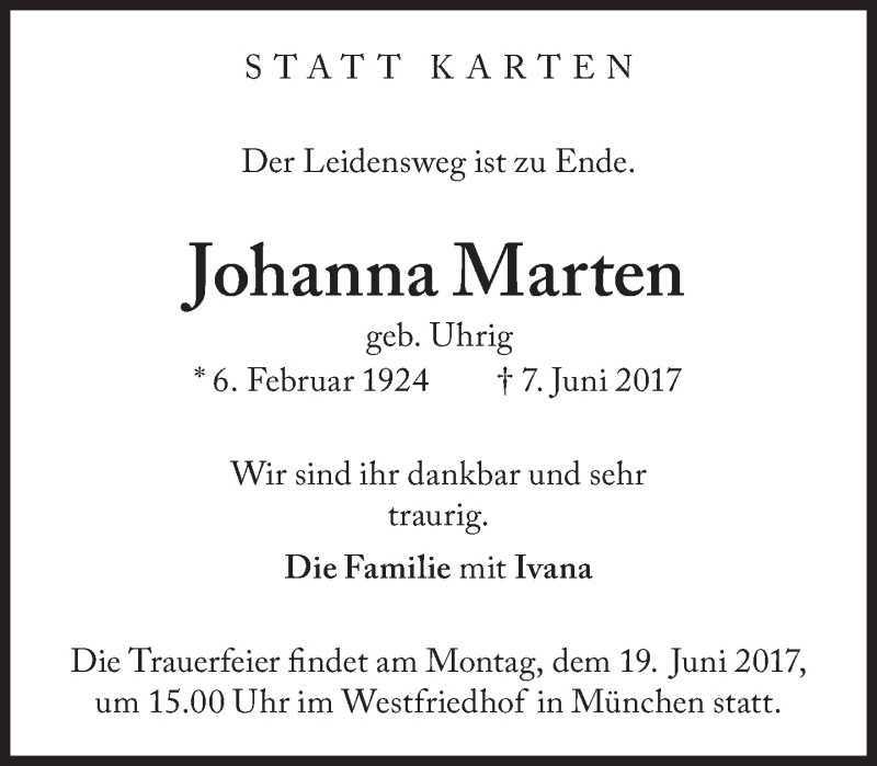 Hier finden Sie alle Traueranzeigen aus der Zeitung, die bisher für Johanna Marten erschienen sind. Weitere Traueranzeigen, die in der Zeitung erscheinen, werden hier ebenfalls aufgelistet