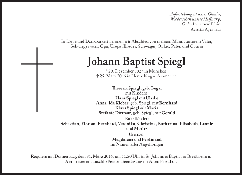 Hier finden Sie alle Traueranzeigen aus der Zeitung, die bisher für Johann Baptist Spiegl erschienen sind. Weitere Traueranzeigen, die in der Zeitung erscheinen, werden hier ebenfalls aufgelistet