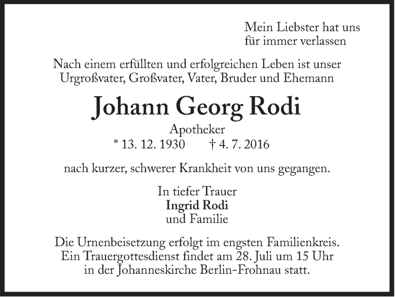 Hier finden Sie alle Traueranzeigen aus der Zeitung, die bisher für Johann Georg Rodi erschienen sind. Weitere Traueranzeigen, die in der Zeitung erscheinen, werden hier ebenfalls aufgelistet