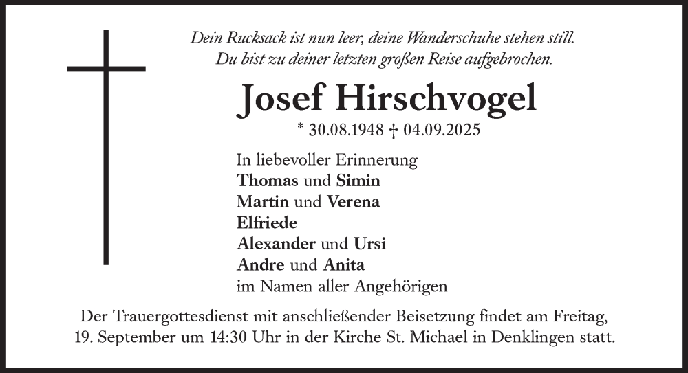 Hier finden Sie alle Traueranzeigen aus der Zeitung, die bisher für Josef Hirschvogel erschienen sind. Weitere Traueranzeigen, die in der Zeitung erscheinen, werden hier ebenfalls aufgelistet