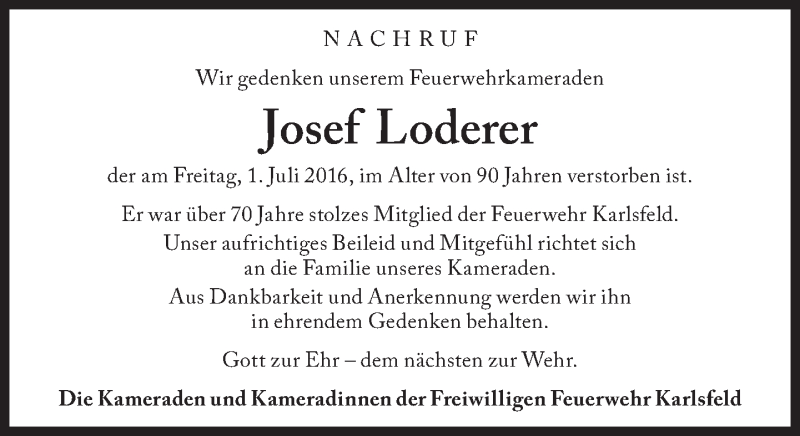 Hier finden Sie alle Traueranzeigen aus der Zeitung, die bisher für Josef Loderer erschienen sind. Weitere Traueranzeigen, die in der Zeitung erscheinen, werden hier ebenfalls aufgelistet