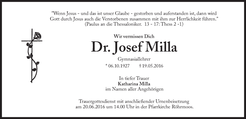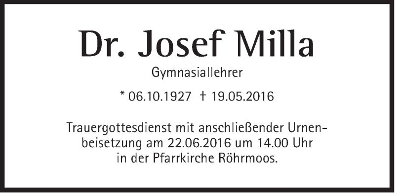 Hier finden Sie alle Traueranzeigen aus der Zeitung, die bisher für Josef Milla erschienen sind. Weitere Traueranzeigen, die in der Zeitung erscheinen, werden hier ebenfalls aufgelistet