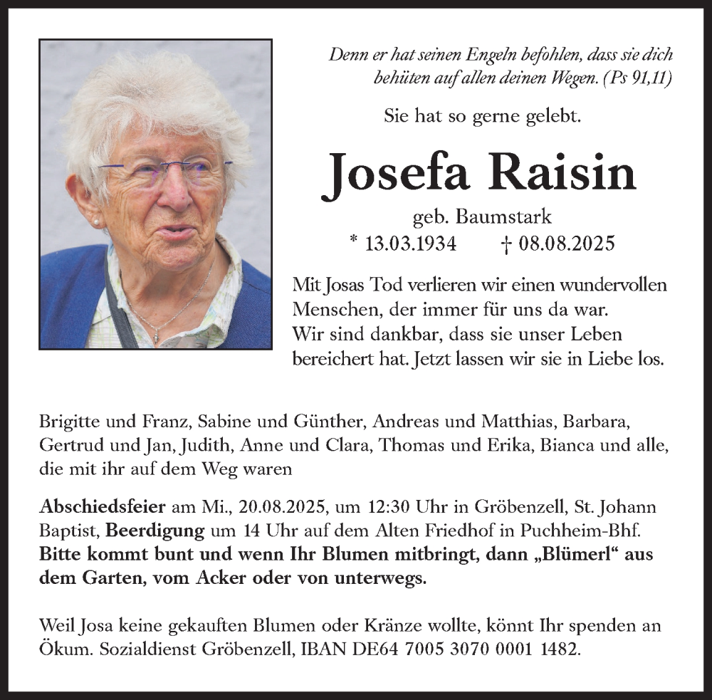 Hier finden Sie alle Traueranzeigen aus der Zeitung, die bisher für Josefa Raisin erschienen sind. Weitere Traueranzeigen, die in der Zeitung erscheinen, werden hier ebenfalls aufgelistet