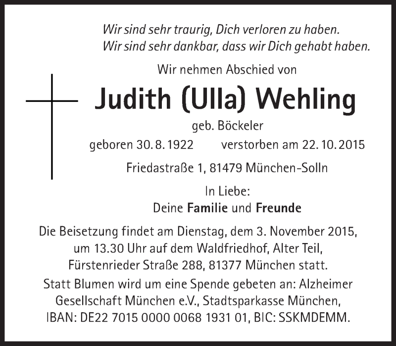 Hier finden Sie alle Traueranzeigen aus der Zeitung, die bisher für Judith Wehling erschienen sind. Weitere Traueranzeigen, die in der Zeitung erscheinen, werden hier ebenfalls aufgelistet