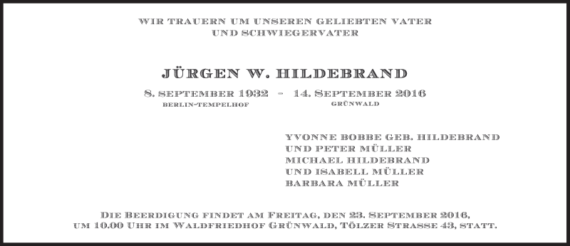 Hier finden Sie alle Traueranzeigen aus der Zeitung, die bisher für Jürgen W. Hildebrand erschienen sind. Weitere Traueranzeigen, die in der Zeitung erscheinen, werden hier ebenfalls aufgelistet