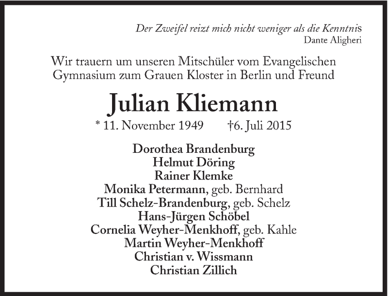 Hier finden Sie alle Traueranzeigen aus der Zeitung, die bisher für Julian Kliemann erschienen sind. Weitere Traueranzeigen, die in der Zeitung erscheinen, werden hier ebenfalls aufgelistet