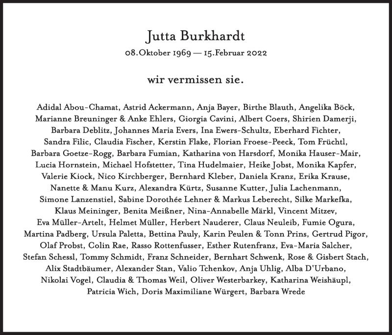 Hier finden Sie alle Traueranzeigen aus der Zeitung, die bisher für Jutta Burkhardt erschienen sind. Weitere Traueranzeigen, die in der Zeitung erscheinen, werden hier ebenfalls aufgelistet
