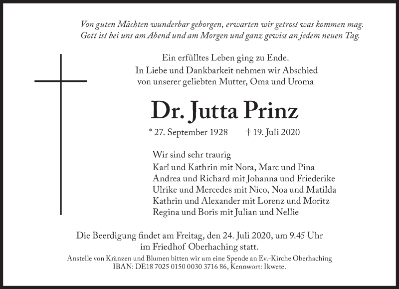 Hier finden Sie alle Traueranzeigen aus der Zeitung, die bisher für Jutta Prinz erschienen sind. Weitere Traueranzeigen, die in der Zeitung erscheinen, werden hier ebenfalls aufgelistet