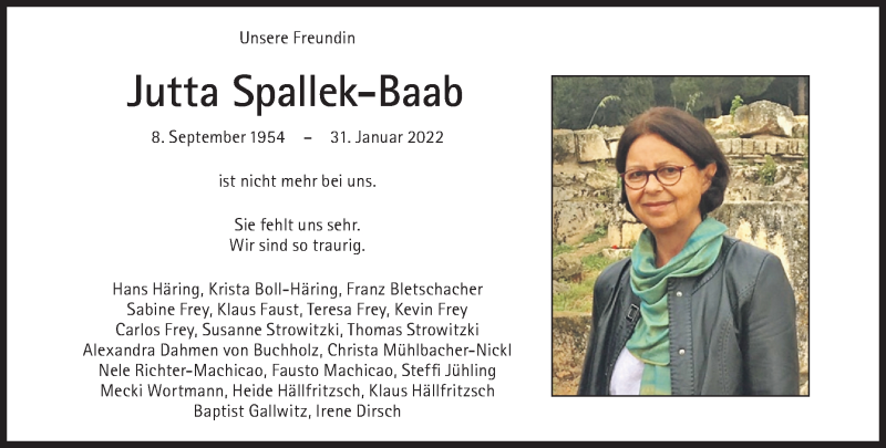 Hier finden Sie alle Traueranzeigen aus der Zeitung, die bisher für Jutta Spallek-Baab erschienen sind. Weitere Traueranzeigen, die in der Zeitung erscheinen, werden hier ebenfalls aufgelistet
