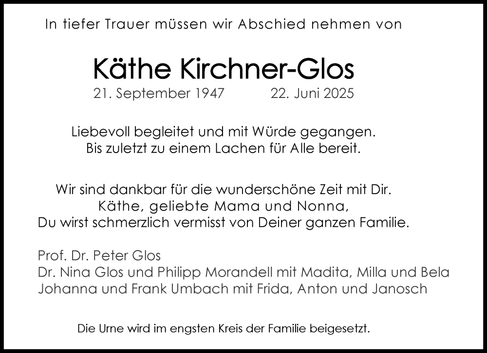 Hier finden Sie alle Traueranzeigen aus der Zeitung, die bisher für Käthe Kirchner-Glos erschienen sind. Weitere Traueranzeigen, die in der Zeitung erscheinen, werden hier ebenfalls aufgelistet