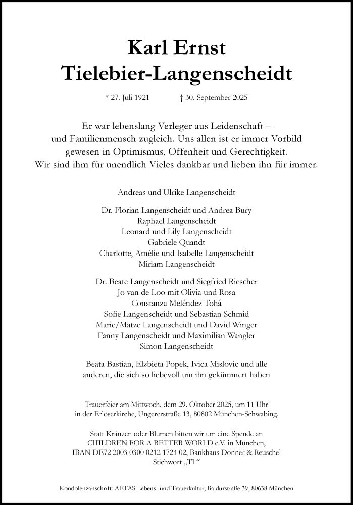Hier finden Sie alle Traueranzeigen aus der Zeitung, die bisher für Karl Ernst Tielebier-Langenscheidt erschienen sind. Weitere Traueranzeigen, die in der Zeitung erscheinen, werden hier ebenfalls aufgelistet