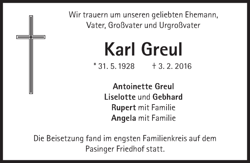 Hier finden Sie alle Traueranzeigen aus der Zeitung, die bisher für Karl Greul erschienen sind. Weitere Traueranzeigen, die in der Zeitung erscheinen, werden hier ebenfalls aufgelistet