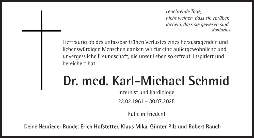 Hier finden Sie alle Traueranzeigen aus der Zeitung, die bisher für Karl-Michael Schmid erschienen sind. Weitere Traueranzeigen, die in der Zeitung erscheinen, werden hier ebenfalls aufgelistet