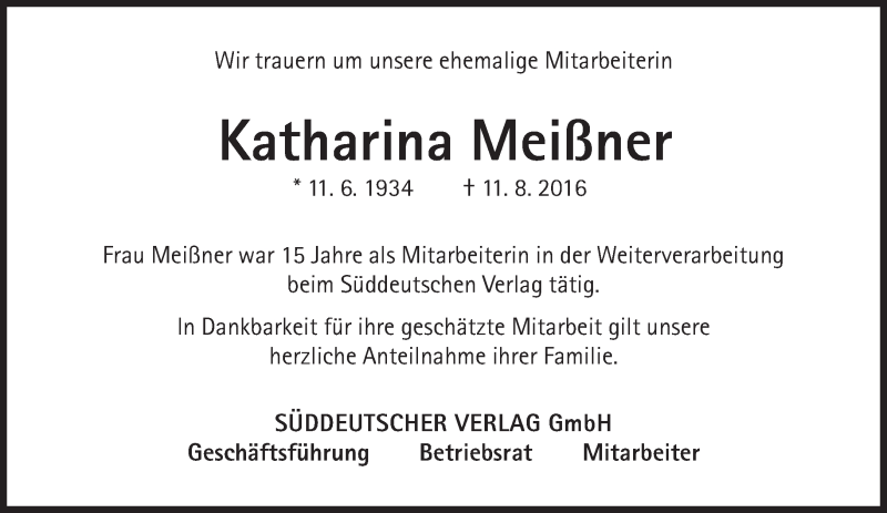 Hier finden Sie alle Traueranzeigen aus der Zeitung, die bisher für Katharina Meißner erschienen sind. Weitere Traueranzeigen, die in der Zeitung erscheinen, werden hier ebenfalls aufgelistet