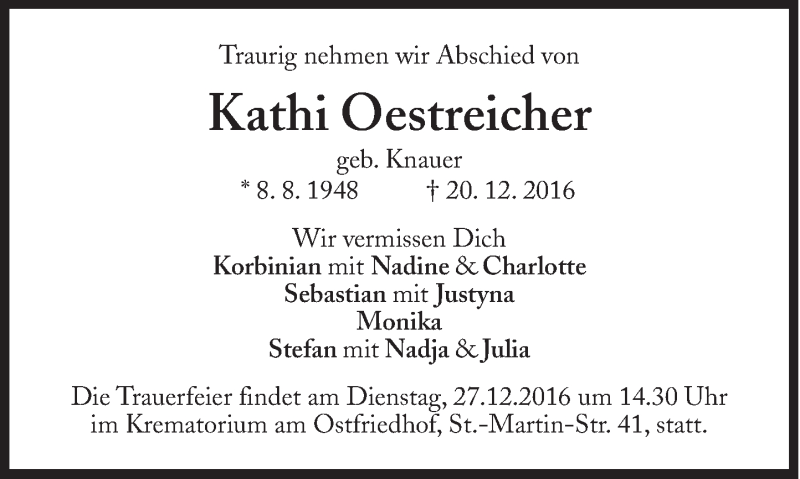 Hier finden Sie alle Traueranzeigen aus der Zeitung, die bisher für Kathi Oestreicher erschienen sind. Weitere Traueranzeigen, die in der Zeitung erscheinen, werden hier ebenfalls aufgelistet
