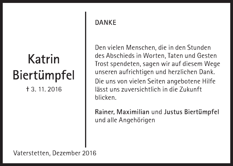 Hier finden Sie alle Traueranzeigen aus der Zeitung, die bisher für Katrin Biertümpfel erschienen sind. Weitere Traueranzeigen, die in der Zeitung erscheinen, werden hier ebenfalls aufgelistet