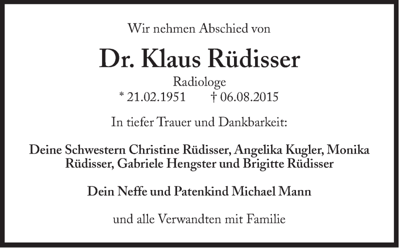 Hier finden Sie alle Traueranzeigen aus der Zeitung, die bisher für Klaus Rüdisser erschienen sind. Weitere Traueranzeigen, die in der Zeitung erscheinen, werden hier ebenfalls aufgelistet