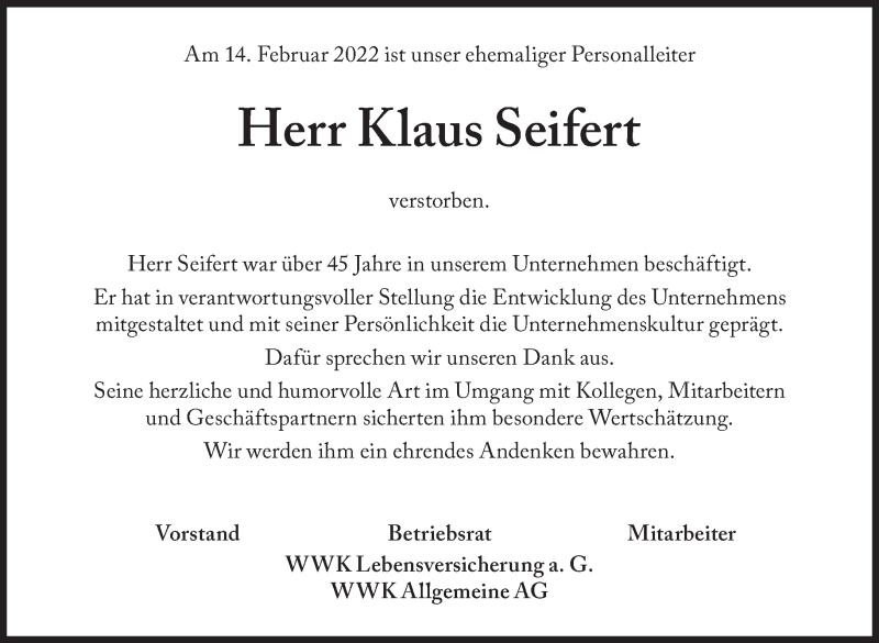 Hier finden Sie alle Traueranzeigen aus der Zeitung, die bisher für Klaus Seifert erschienen sind. Weitere Traueranzeigen, die in der Zeitung erscheinen, werden hier ebenfalls aufgelistet