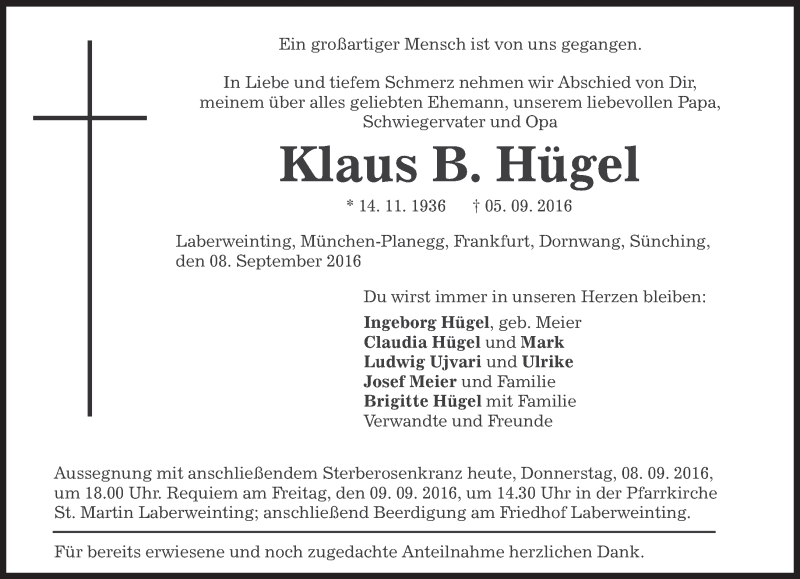Hier finden Sie alle Traueranzeigen aus der Zeitung, die bisher für Klaus B. Hügel erschienen sind. Weitere Traueranzeigen, die in der Zeitung erscheinen, werden hier ebenfalls aufgelistet