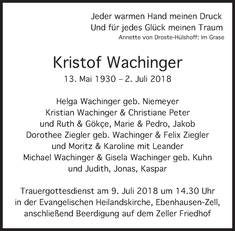 Hier finden Sie alle Traueranzeigen aus der Zeitung, die bisher für Kristof Wachinger erschienen sind. Weitere Traueranzeigen, die in der Zeitung erscheinen, werden hier ebenfalls aufgelistet
