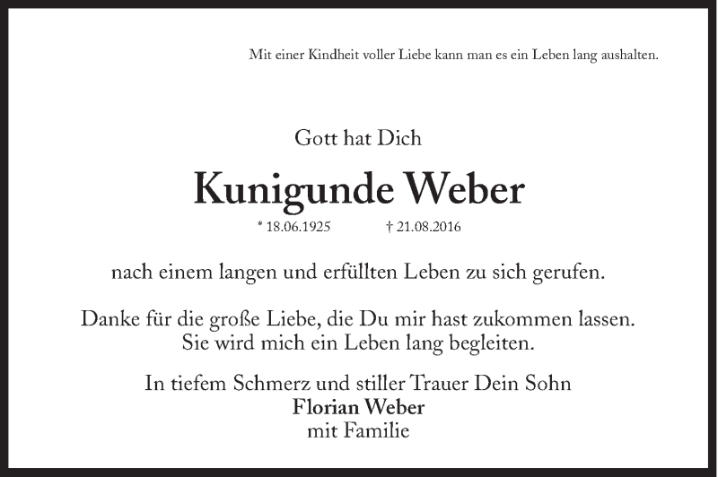 Hier finden Sie alle Traueranzeigen aus der Zeitung, die bisher für Kunigunde Weber erschienen sind. Weitere Traueranzeigen, die in der Zeitung erscheinen, werden hier ebenfalls aufgelistet