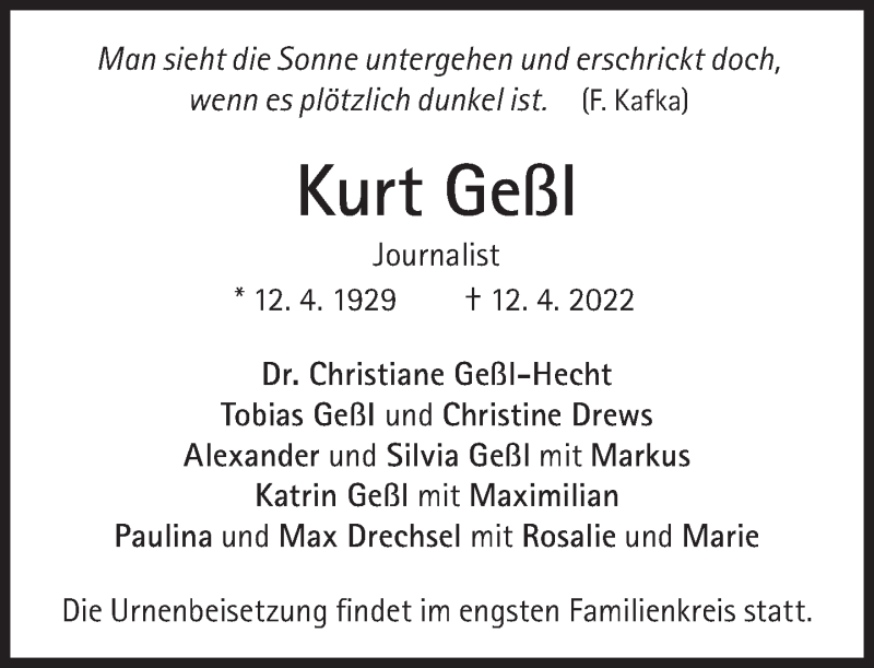 Hier finden Sie alle Traueranzeigen aus der Zeitung, die bisher für Kurt Geßl erschienen sind. Weitere Traueranzeigen, die in der Zeitung erscheinen, werden hier ebenfalls aufgelistet