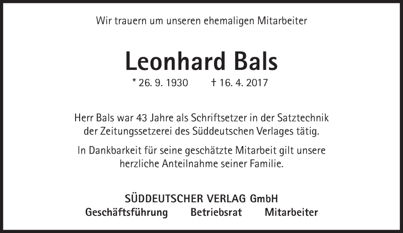 Hier finden Sie alle Traueranzeigen aus der Zeitung, die bisher für Leonhard Bals erschienen sind. Weitere Traueranzeigen, die in der Zeitung erscheinen, werden hier ebenfalls aufgelistet