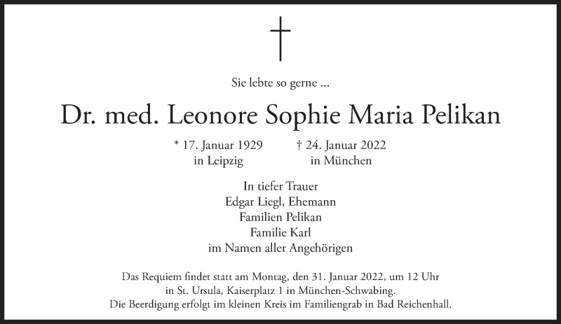 Hier finden Sie alle Traueranzeigen aus der Zeitung, die bisher für Leonore Sophie Maria Pelikan erschienen sind. Weitere Traueranzeigen, die in der Zeitung erscheinen, werden hier ebenfalls aufgelistet