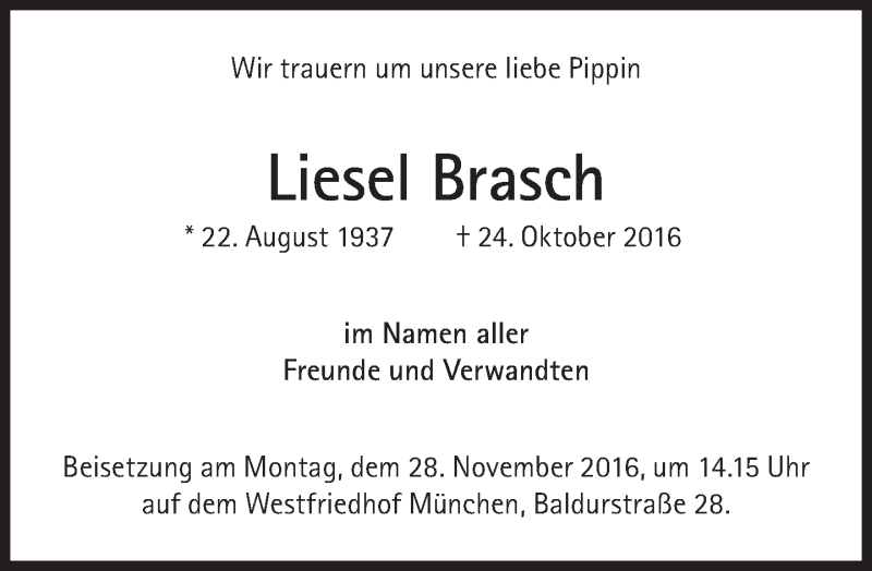 Hier finden Sie alle Traueranzeigen aus der Zeitung, die bisher für Liesel Brasch erschienen sind. Weitere Traueranzeigen, die in der Zeitung erscheinen, werden hier ebenfalls aufgelistet