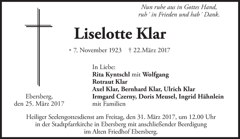 Hier finden Sie alle Traueranzeigen aus der Zeitung, die bisher für Liselotte Klar erschienen sind. Weitere Traueranzeigen, die in der Zeitung erscheinen, werden hier ebenfalls aufgelistet